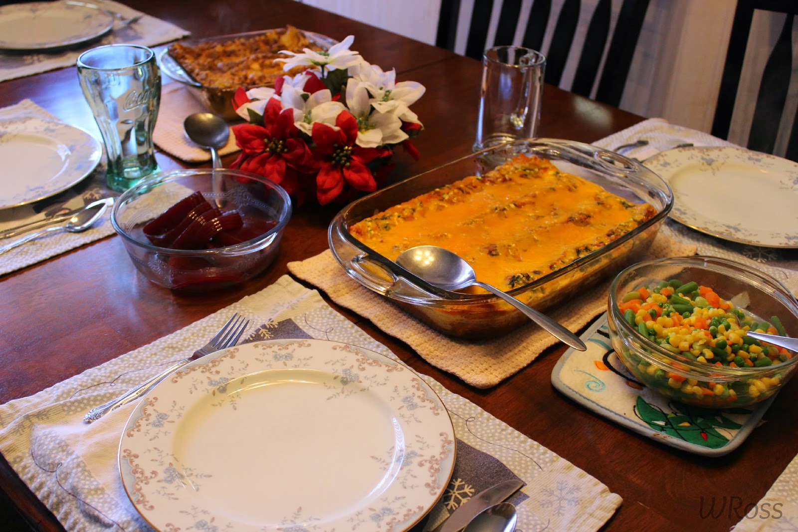 Christmas dinner, simple as it is. Spinach lasagna (vegetarian). Tomato-less, cheeseless lasagna with deer burger in it. Mixed veggies. Cranberry sauce. Not even any dessert.